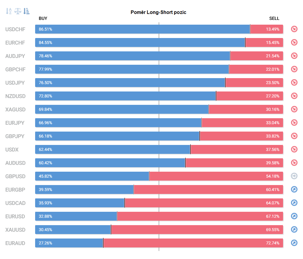 Přinášíme pohled na aktuálně otevřené pozice retailových obchodníků (běžných traderů) na forexu. Jde o reverzní - contrarian indikátor, který pokud naznačuje velkou míru short pozic, tak to může znamenat další pokračování v růstu (a naopak). Je to z důvodu předpokladu, že trh půjde proti retailu, který se většinu času snaží jít proti trendu. -