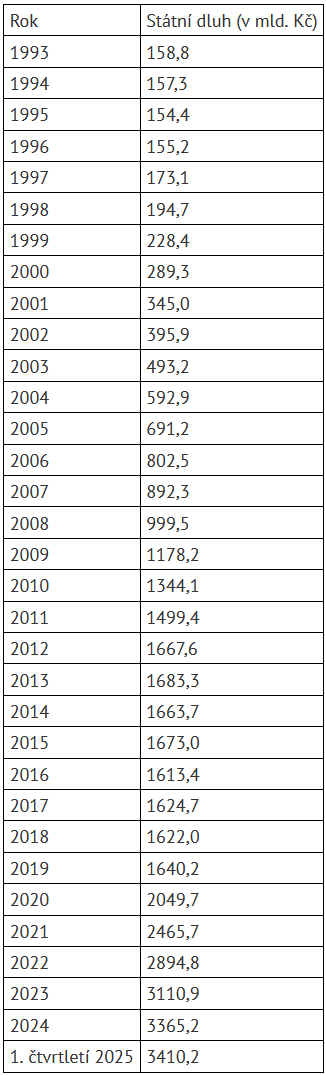 Vývoj státního dluhu v miliardách korun: