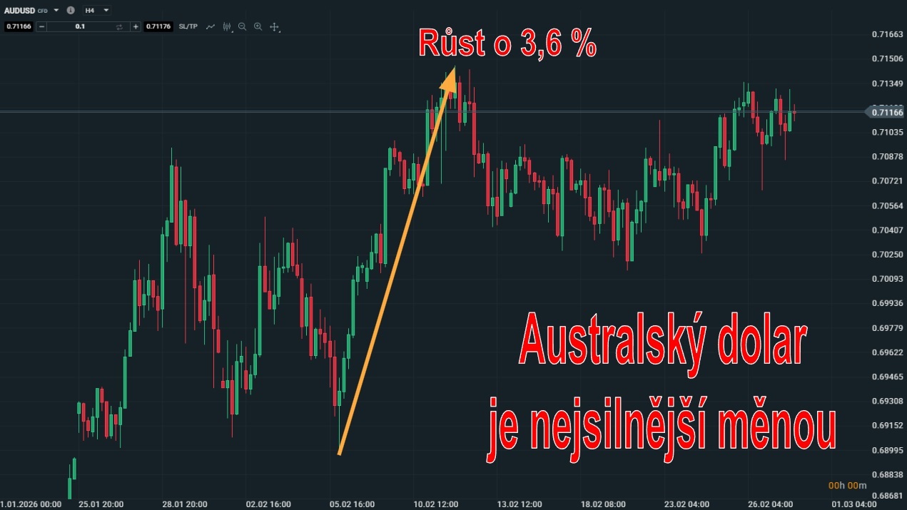 Suverénně nejsilnější měnou se v únoru stal australský dolar, který si pro tento titul došel pomocí nekompromisního růstového trendu. Během růstu sice měnový pár AUD/USD vykázal několik menších prodejních korekcí, nicméně i tak měsíc zakončil posílením o 3,6 %, což nabídlo obchodníkům perfektní příležitost k zisku.
