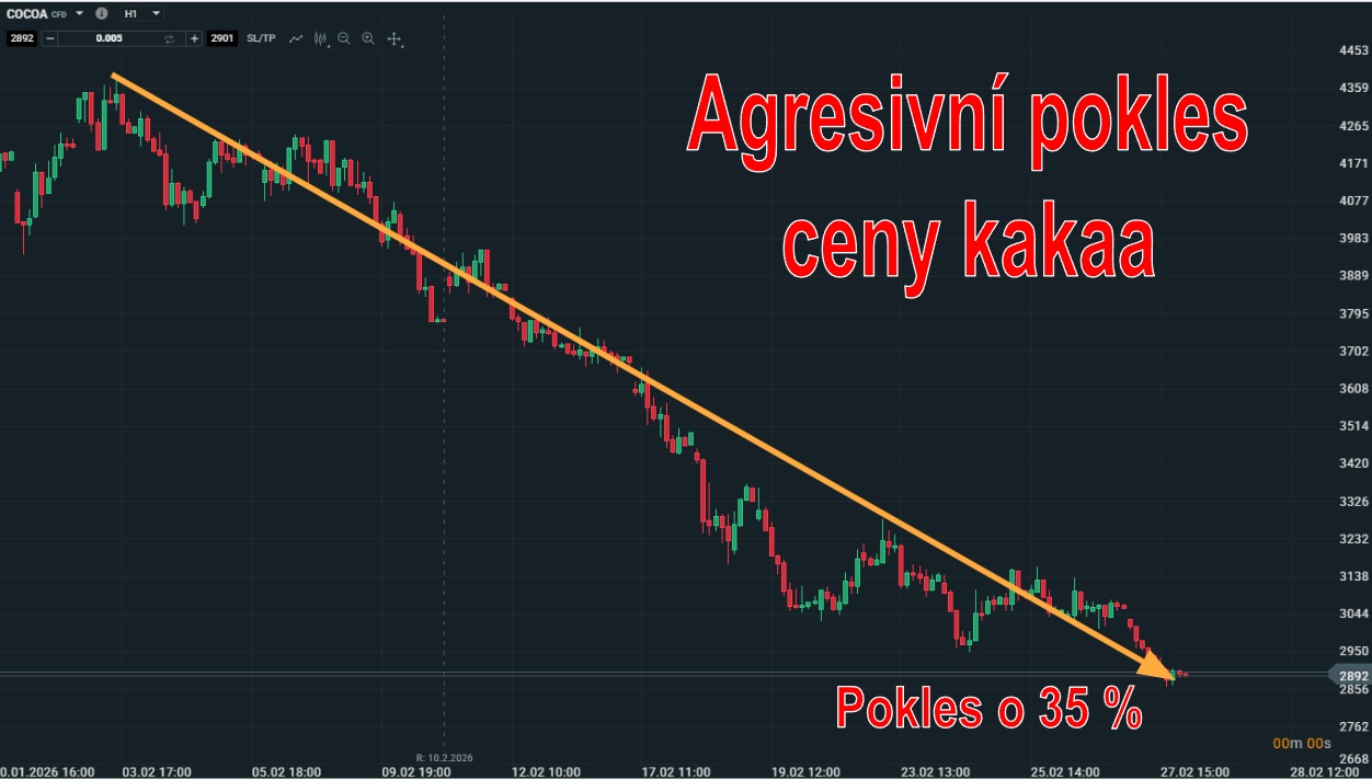 Výrazný cenový pokles postihl i kakao, které tak pokračovalo ve svém střednědobém cenovém poklesu. Konečná ztráta ceny v únoru činila 35 %, což je swingový pohyb, který zas tak často na tomto trhu není k vidění. Koncem února tak kakao nabídlo obchodníkům možnost realizovat pohádkové zisky.