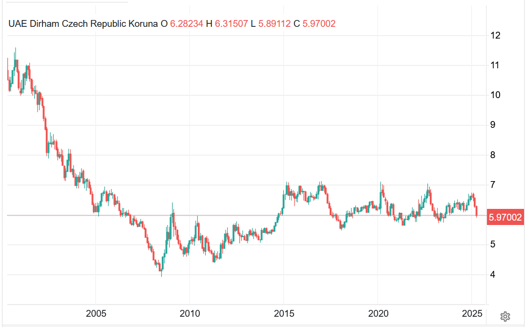 Vývoj kurzu dirhamu vůči české koruně – AED/CZK (měsíční časový rámec):