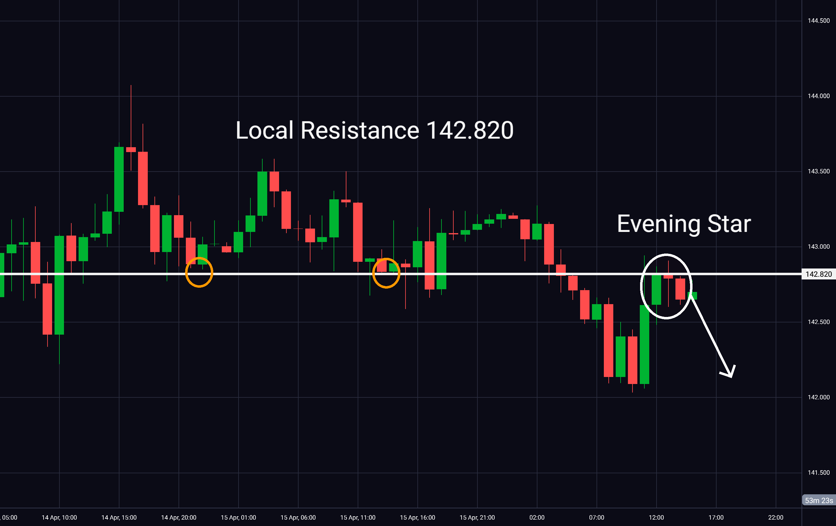 USD/JPY: Tento měnový pár je na 1hodinovém grafu v rostoucím trendu několik hodin. Vytvořila se formace večerní hvězda (Evening Star) na lokální rezistenci. Cena je tak připravena na pokles a mohli bychom uvažovat o short pozici. Blížící se fundamentální zprávy (maloobchodní tržby v USA) by mohly ovlivnit vývoj tohoto měnového páru.