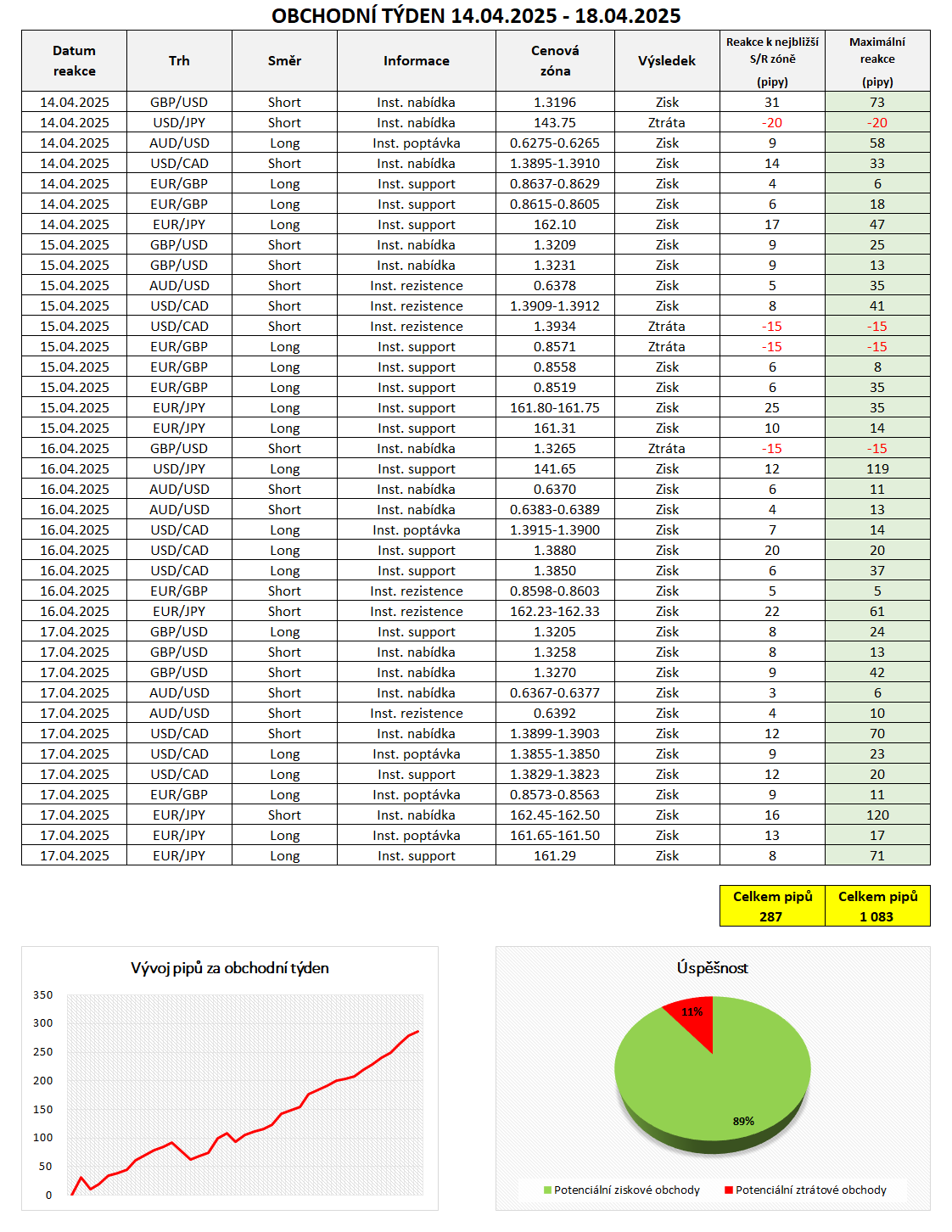 Na základě informací z mezibankovního trhu bylo v minulém týdnu možné vstoupit do 38 obchodů, z nichž 34 by bylo ziskových a 4 ztrátové. Celková úspěšnost tak byla 89 %. Celkově bylo možné za minulý týden potencionálně zachytit reakce ve výši 287 pipů, bereme-li v úvahu potenciální umístění Profit-Targetu k nejbližší S/R zóně. Stop-Loss naopak nejčastěji umisťujeme na logické místo ve vzdálenosti 15 - 20 pipů v závislosti na šířce dané institucionální objednávky a volatilitě. Konkrétní obchodní příležitosti jsme zaznamenali do tabulky níže, přidáváme také equity křivku v pipech.