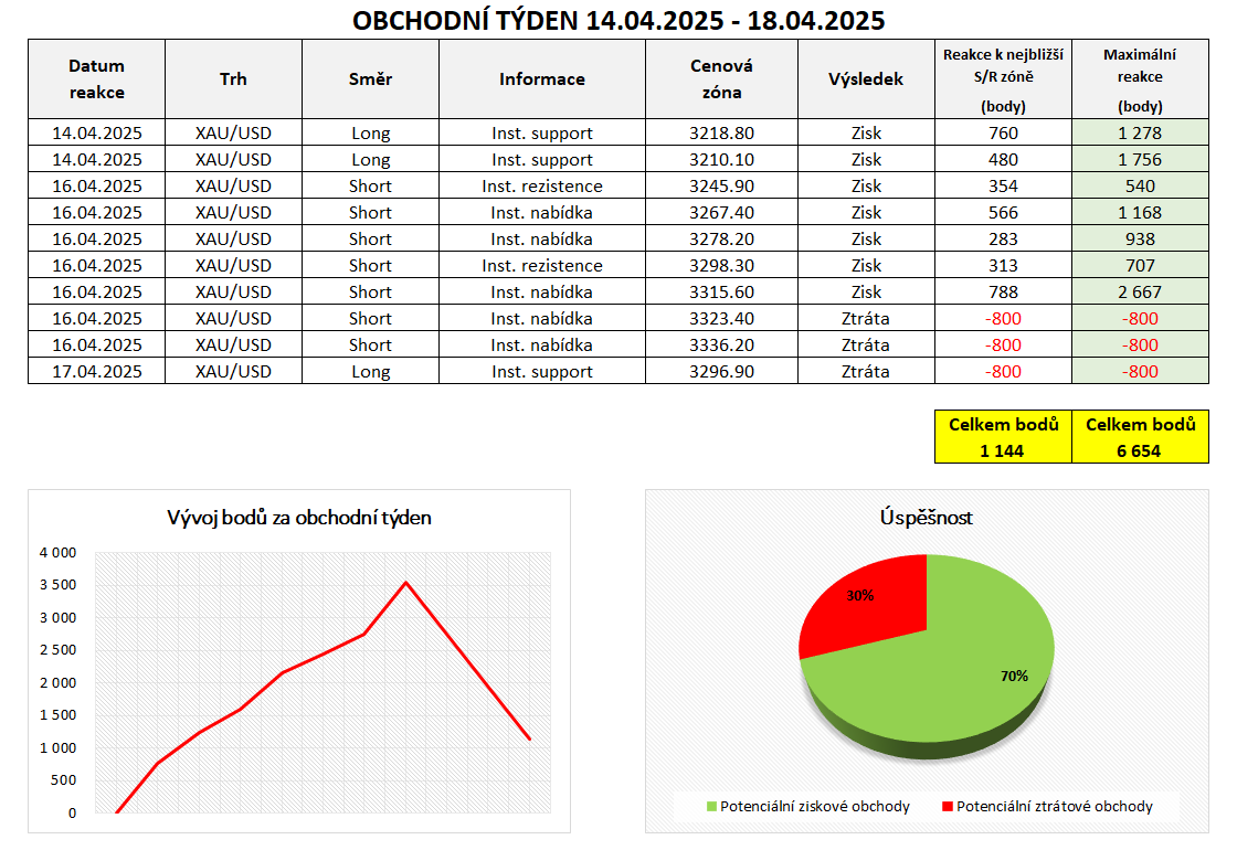 Nově rovněž zaznamenáváme reakce na trhu se zlatem (XAU/USD). Na tomto trhu bylo minulý týden celkem 10 obchodních příležitostí, z nichž 7 bylo úspěšných. To představuje úspěšnost 70 %. Celkově bylo možné za minulý týden potencionálně zachytit reakce ve výši 1144 bodů. Pokud trh na institucionální objednávku nereagoval, zaznamenali jsme ztrátu 400 bodů.