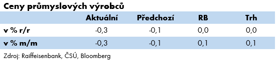 Ceny průmyslových výrobců se meziměsíčně zvýšily o 0,1 % a meziročně poklesly o 1,2 %. Výsledek byl téměř v souladu s naší prognózou. Meziročně nejvíce poklesly ceny elektřiny, plynu, páry a klimatizovaného vzduchu (-4,0 %), ceny koksu a rafinérských ropných výrobků a ceny chemických látek a přípravků (-6,9 %) a ceny černého a hnědého uhlí a lignitu (-10,4 %). -