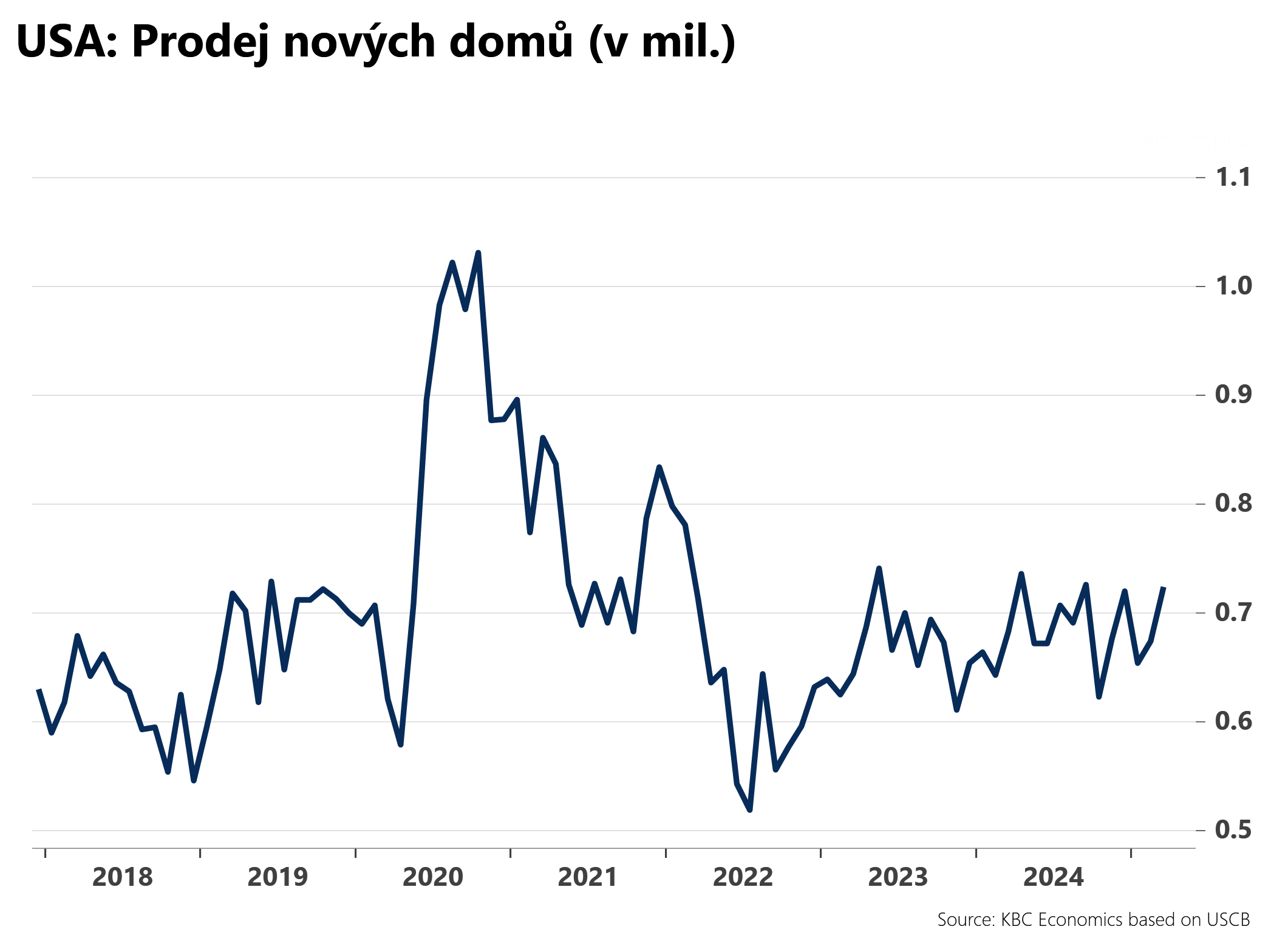 Počet prodaných nových domů v říjnu mírně stoupl na 745 tis. oproti revidovaným 742 tis. v září. Trhy očekávaly růst 800 tis. prodaných nových domů. -