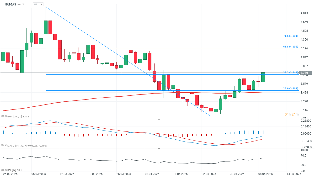 Ačkoliv jsou zásoby aktuálně dobře zásobené, plánované odstávky zařízení mohou v krátkodobém horizontu poskytnout cenovou podporu – i za předpokladu, že počasí zůstane mírné. Dnešní růst NATGAS zároveň překonal 38,2% Fibonacciho retracement poslední sestupné vlny z března.