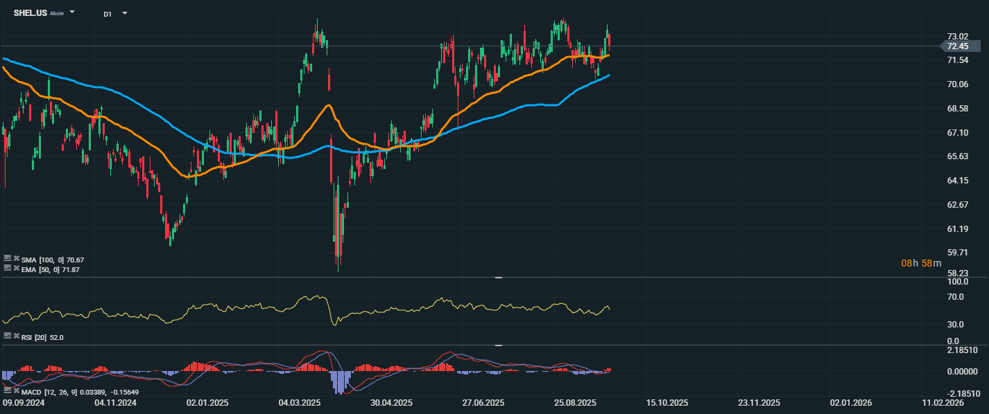 Akcie společnosti Shell se aktuálně obchodují na úrovni 72,45 USD a udržují se nad oběma důležitými klouzavými průměry – EMA 50 na hodnotě 71,87 USD a SMA 100 na úrovni 70,67 USD. RSI dosahuje hodnoty 52,0 a nachází se v neutrálním pásmu, bez známek překoupenosti či přeprodanosti. To dává akciím prostor k dalšímu růstu bez nutné korekce.