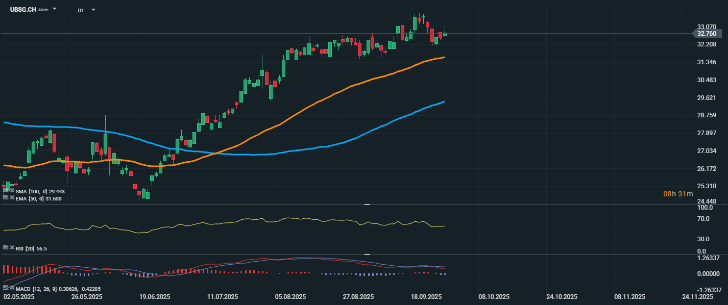 Akcie švýcarské banky UBS se aktuálně obchodují za 32,76 CHF a i nadále se drží v pozitivním technickém nastavení. Cena zůstává nad klouzavým průměrem EMA 50 (31,60 CHF) i nad SMA 100 (29,44 CHF). RSI se nachází na hodnotě 56,5, tedy v neutrálním pásmu, které naznačuje, že na trhu zatím není výrazné překoupení ani přeprodanost. MACD se drží těsně nad nulovou linií, ale histogram začíná slábnout, což ukazuje na mírné zpomalení tempa růstu.