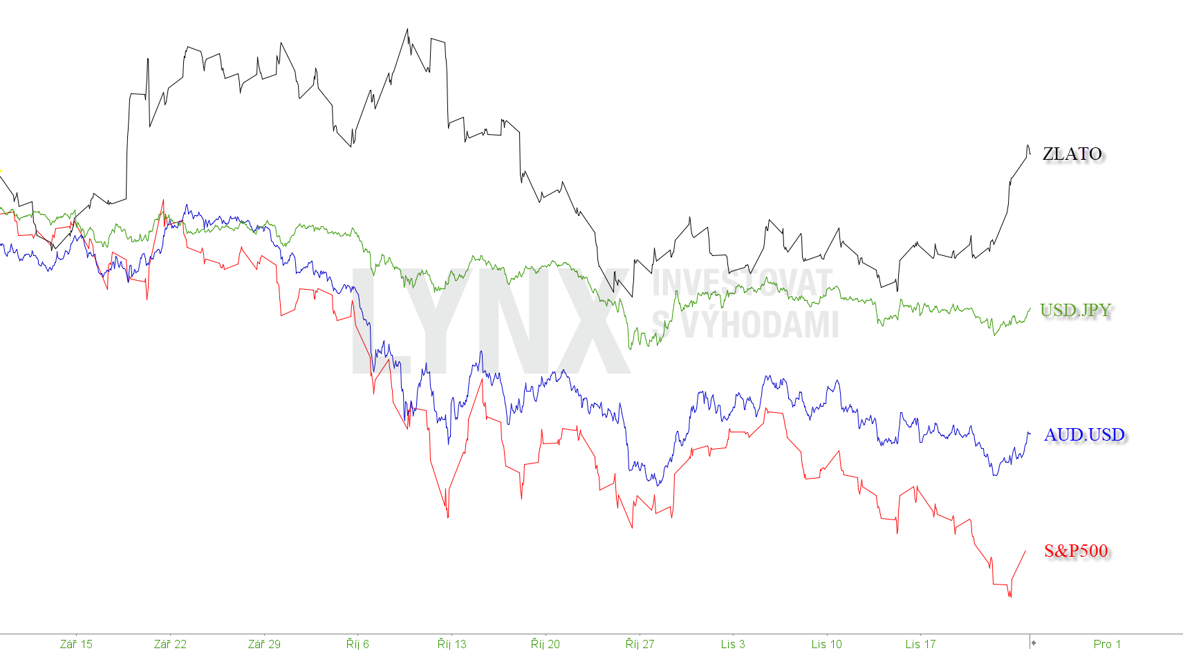 Graf vývoje zlata (ETF GLD), akciového indexu S&P 500 (SPX) a měnových párů USD/JPY a AUD/USD za období září až listopad 2018.