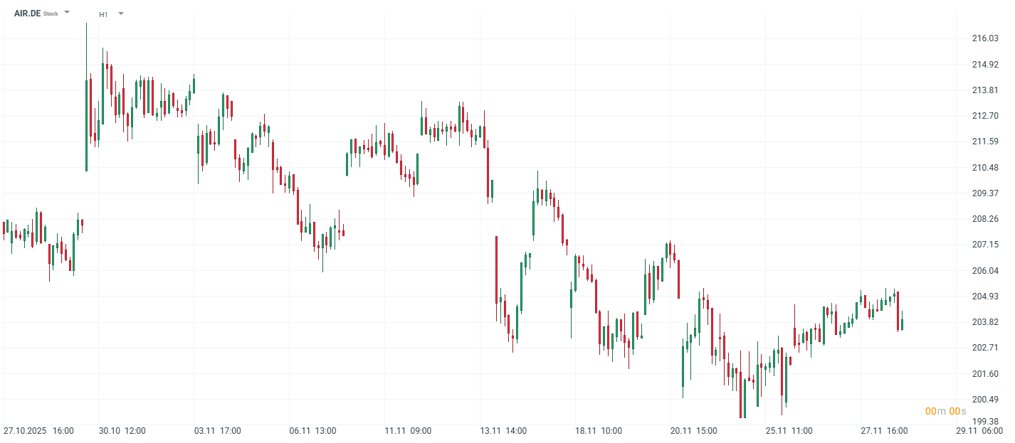 Vývoj ceny akcií Airbus (1hodinový graf - H1):