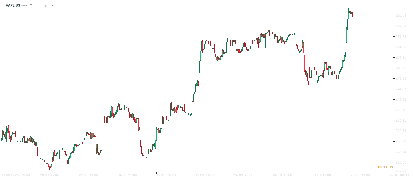 Vývoj ceny akcií Apple (1hodinový graf - H1):