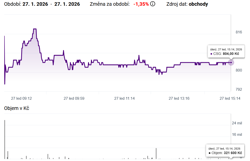 Vývoj ceny akcií CSG (dnešní obchodní seance):