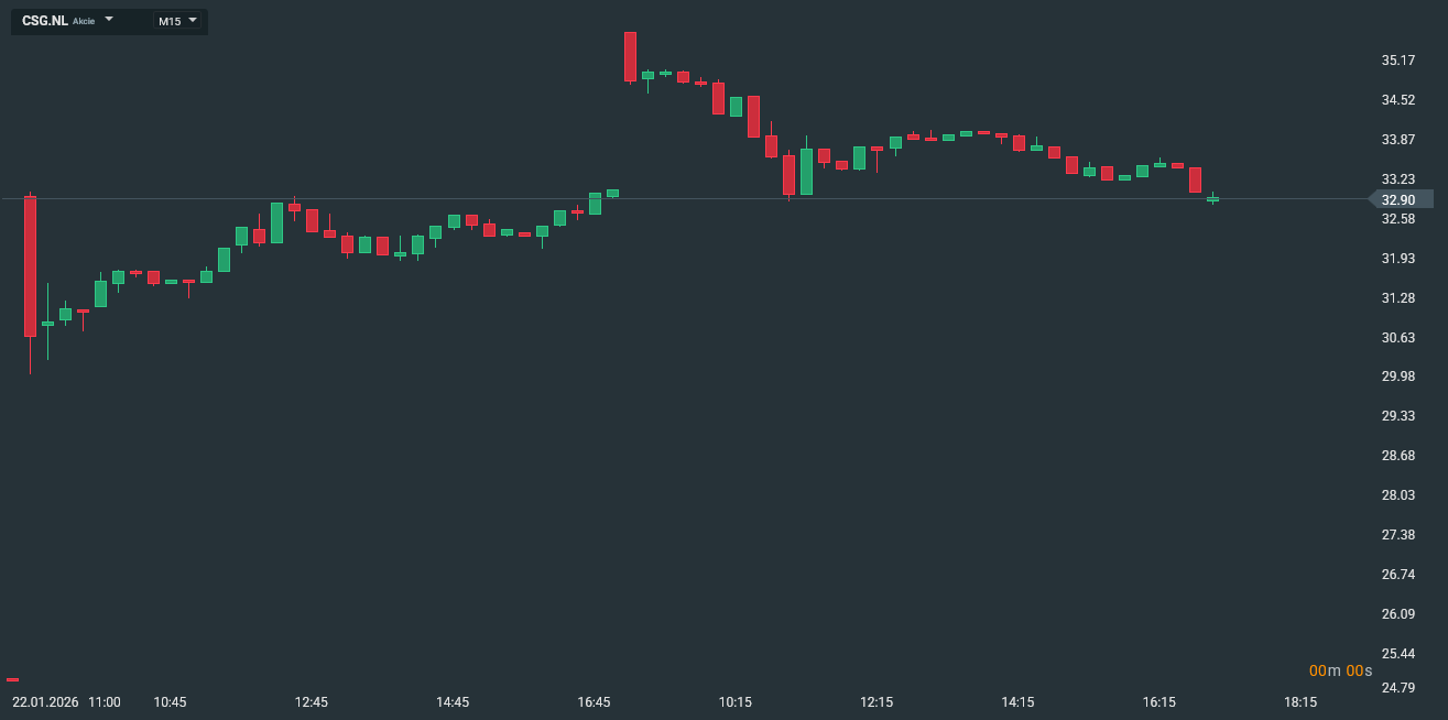 V Amsterdamu cenné papíry CSG dnes otevřely na ceně 35,5 eura (zhruba 861 korun) za kus, což byl ve srovnání s pátečním závěrem nárůst o 8,1 procenta. Otevírací cena ale byla také zároveň dnešním maximem akcií skupiny. Během dne jejich cena postupně klesala. Hodinu po poledni se ještě obchodovaly za 34 eur (825 korun), proti pátku tak byly silnější o 3,5 procenta. Po 17:30 uzavíraly akcie CSG obchodování na amsterdamské burze Euronext na ceně 32,70 eura (asi 793 korun). Proti předchozímu závěru tak oslabily o 0,46 procenta.
