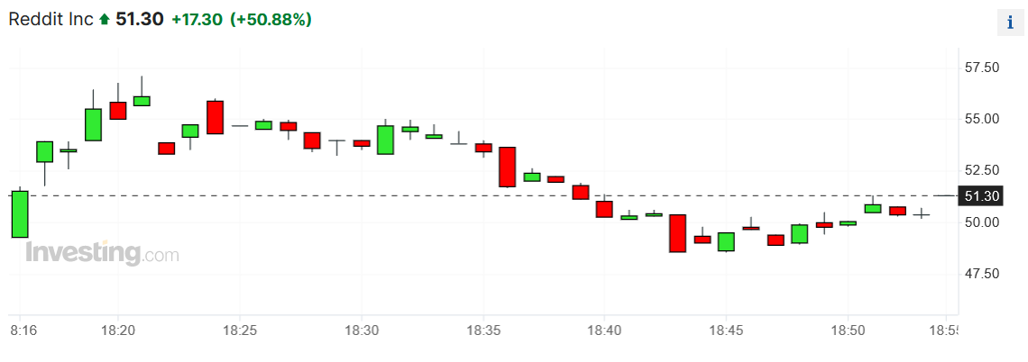 Akcie americké společnosti Reddit, která provozuje stejnojmennou sociální síť, dnes zahájily obchodování na burze v New Yorku růstem o 38 procent. Hodnota firmy tak dosahovala 8,9 miliard dolarů (207,4 miliardy Kč). Akcie firmy dále posilují. Kolem 18:35 SEČ rostly o 58,3 procenta na 53,8 dolaru.