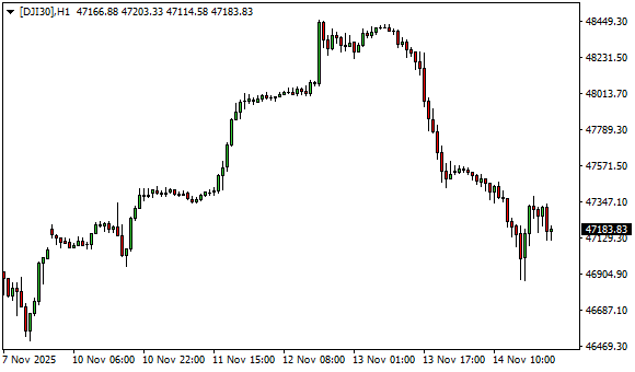 Vývoj akciového indexu Dow Jones (1hodinový graf – H1):