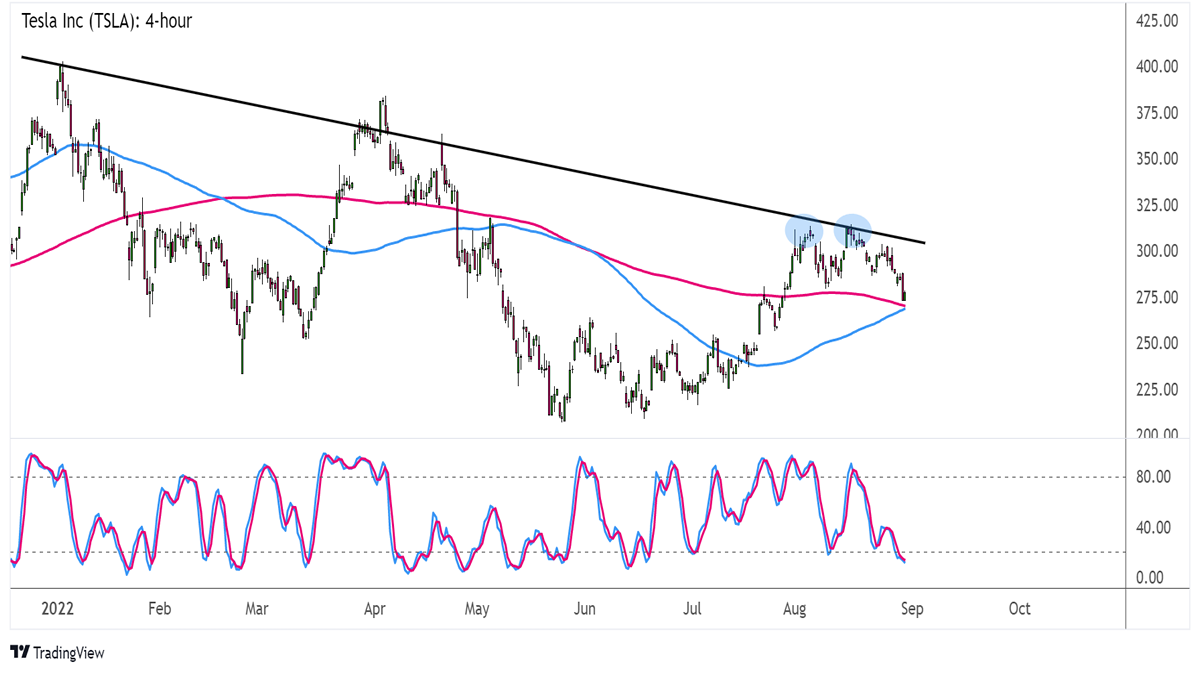 Vývoj akcie TSLA (4hodinový graf – H4):
