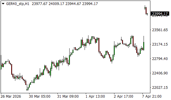 Vývoj akciového indexu DAX (1hodinový graf - H1):