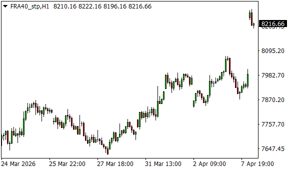 Vývoj akciového indexu CAC 40 (1hodinový graf - H1):