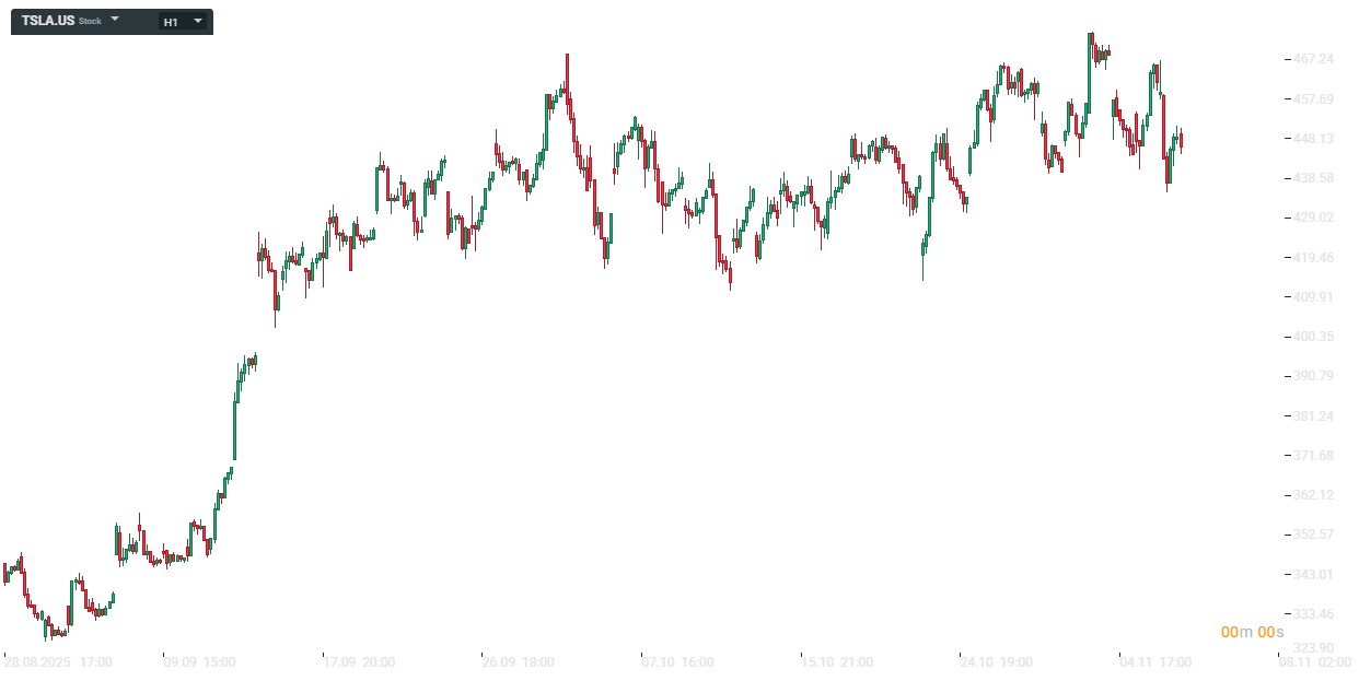 Vývoj ceny akcií Tesla (1hodinový graf - H1):