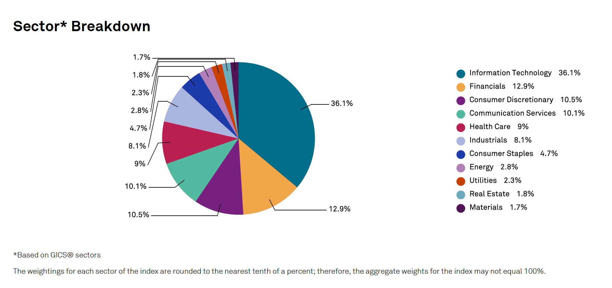 Největší váhu mají nepřekvapivě akcie ze sektoru informačních technologií, které spolu se sektorem finančních služeb mají v celém indexu poloviční váhu.