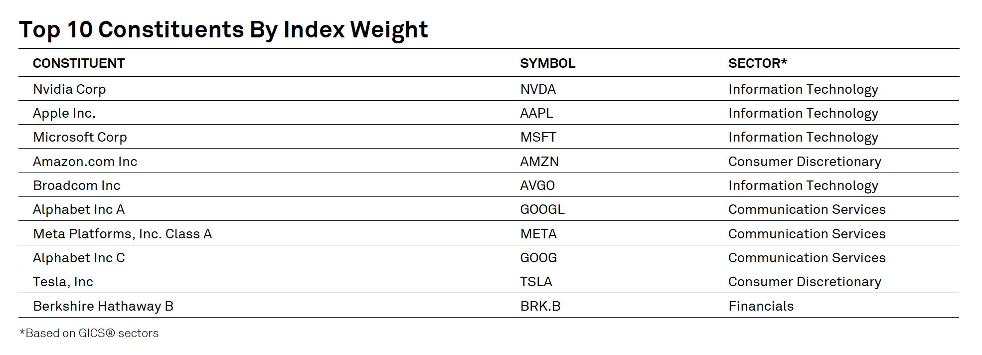 Na prvním místě je společnost Nvidia, která měla k 31. říjnu 2025 tržní kapitalizaci téměř 5 bilionů USD, váha Nvidie v indexu je 8,5 %. Nvidia láme poslední tři roky rekordy, je to první společnost na světě, která na začátku listopadu 2025 dosáhla hranice 5 bilionů dolarů tržní kapitalizace.