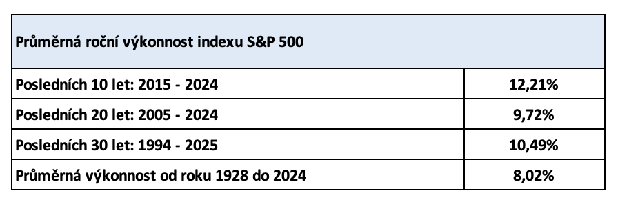 Jaký byl průměrný roční výnos indexu S&P 500 za posledních téměř 100 let, ukazuje tabulka níže:
