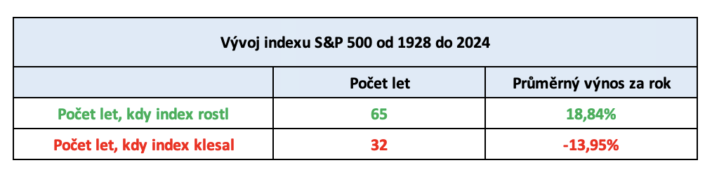 Ze všech pádů se akcie vždy zotavily a čísla ukazují, že index v dlouhodobém horizontu roste, počet rostoucích let je dvojnásobný oproti rokům, kdy index padá a průměrný výnos v rostoucích letech je vyšší než průměrný výnos v letech, kdy index padá: