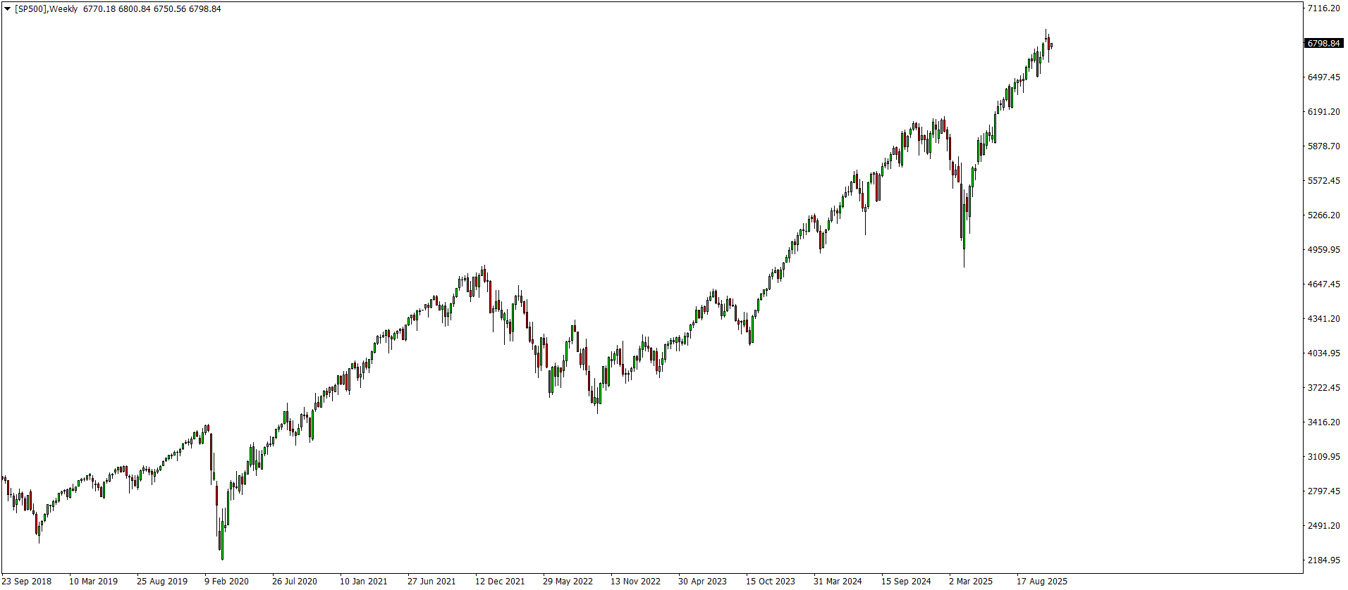 Vývoj akciového indexu S&P 500 (týdenní graf – W1):