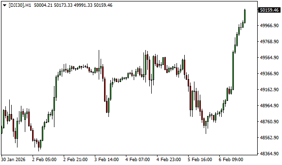 Vývoj akciového indexu Dow Jones (1hodinový graf – H1):