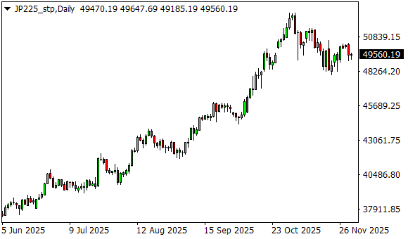 Vývoj akciového indexu Nikkei 225 (denní graf - D1):