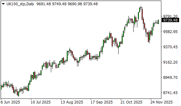 Vývoj akciového indexu FTSE 100 (denní graf - D1):