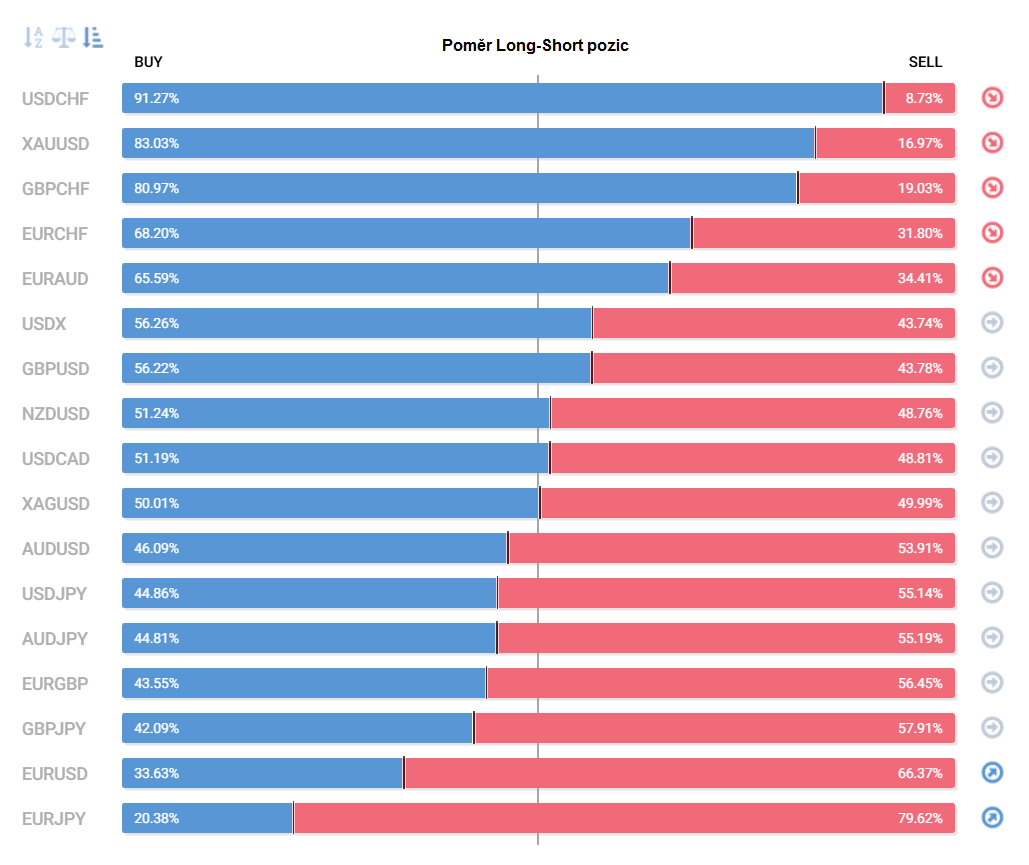 Přinášíme pohled na aktuálně otevřené pozice retailových obchodníků (běžných traderů) na forexu. Jde o reverzní - contrarian indikátor, který pokud naznačuje velkou míru short pozic, tak to může znamenat další pokračování v růstu (a naopak). Je to z důvodu předpokladu, že trh půjde proti retailu, který se většinu času snaží jít proti trendu.