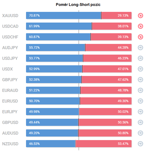 Přinášíme pohled na aktuálně otevřené pozice retailových obchodníků (běžných traderů) na forexu. Jde o reverzní - contrarian indikátor, který pokud naznačuje velkou míru short pozic, tak to může znamenat další pokračování v růstu (a naopak). Je to z důvodu předpokladu, že trh půjde proti retailu, který se většinu času snaží jít proti trendu.