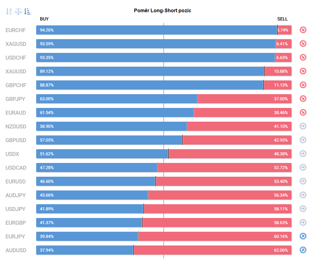 Přinášíme pohled na aktuálně otevřené pozice retailových obchodníků (běžných traderů) na forexu. Jde o reverzní - contrarian indikátor, který pokud naznačuje velkou míru short pozic, tak to může znamenat další pokračování v růstu (a naopak). Je to z důvodu předpokladu, že trh půjde proti retailu, který se většinu času snaží jít proti trendu.