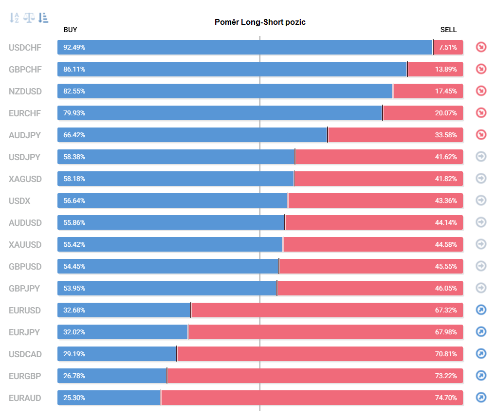 Přinášíme pohled na aktuálně otevřené pozice retailových obchodníků (běžných traderů) na forexu. Jde o reverzní - contrarian indikátor, který pokud naznačuje velkou míru short pozic, tak to může znamenat další pokračování v růstu (a naopak). Je to z důvodu předpokladu, že trh půjde proti retailu, který se většinu času snaží jít proti trendu.