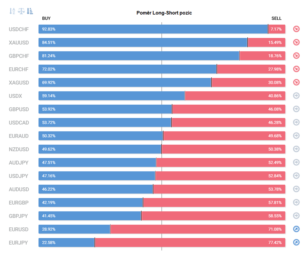 Přinášíme pohled na aktuálně otevřené pozice retailových obchodníků (běžných traderů) na forexu. Jde o reverzní - contrarian indikátor, který pokud naznačuje velkou míru short pozic, tak to může znamenat další pokračování v růstu (a naopak). Je to z důvodu předpokladu, že trh půjde proti retailu, který se většinu času snaží jít proti trendu.