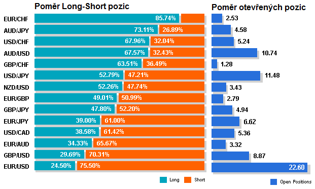 Přinášíme pohled na aktuálně otevřené pozice retailových obchodníků (běžných traderů) na forexu. Jde o reverzní - contrarian indikátor, který pokud naznačuje velkou míru short pozic, tak to může znamenat další pokračování v růstu (a naopak). Je to z důvodu předpokladu, že trh půjde proti retailu, který se většinu času snaží jít proti trendu. -