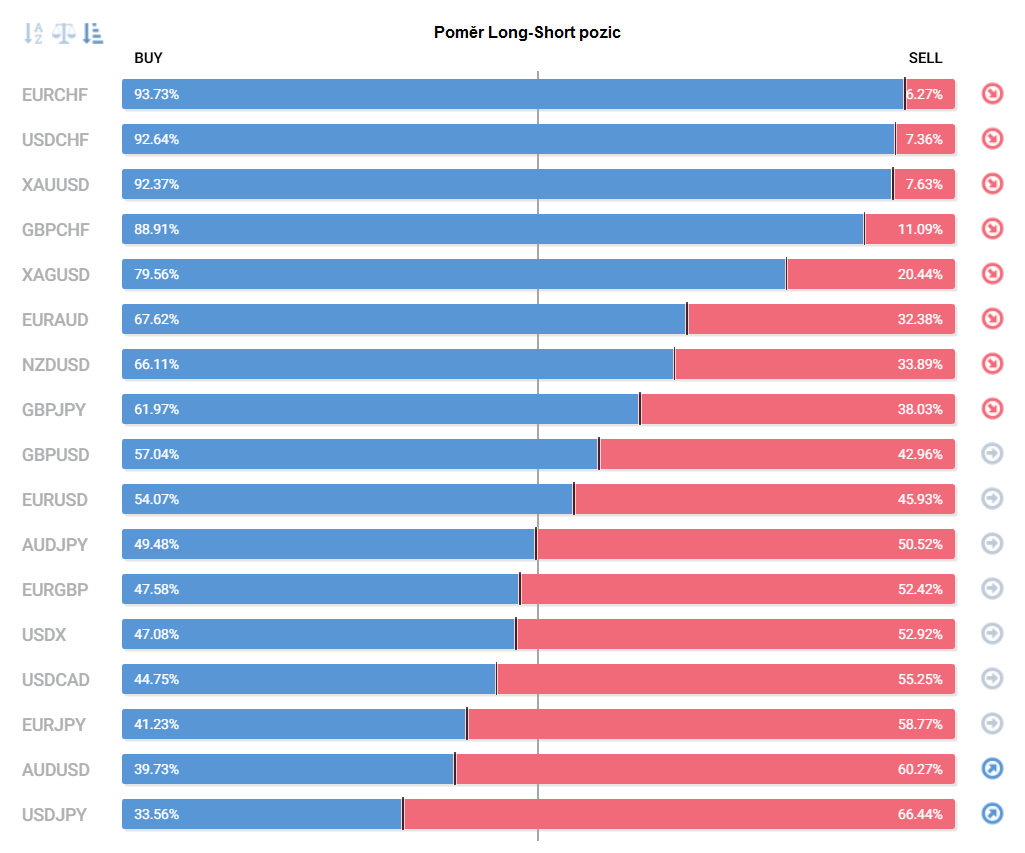 Přinášíme pohled na aktuálně otevřené pozice retailových obchodníků (běžných traderů) na forexu. Jde o reverzní - contrarian indikátor, který pokud naznačuje velkou míru short pozic, tak to může znamenat další pokračování v růstu (a naopak). Je to z důvodu předpokladu, že trh půjde proti retailu, který se většinu času snaží jít proti trendu.
