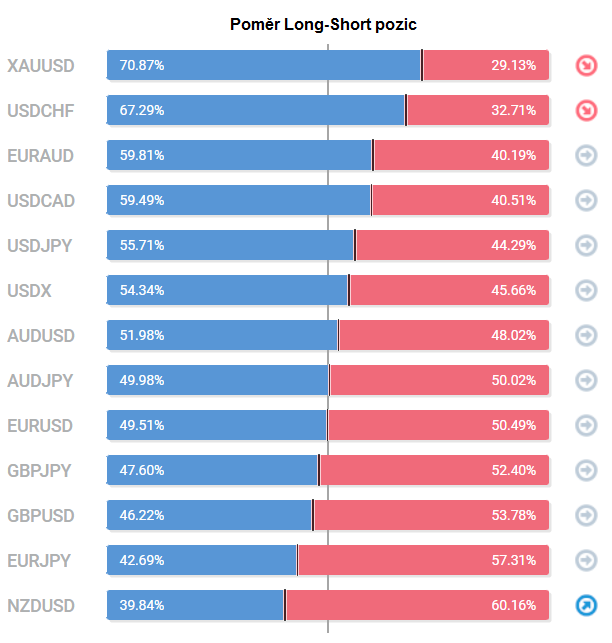Přinášíme pohled na aktuálně otevřené pozice retailových obchodníků (běžných traderů) na forexu. Jde o reverzní - contrarian indikátor, který pokud naznačuje velkou míru short pozic, tak to může znamenat další pokračování v růstu (a naopak). Je to z důvodu předpokladu, že trh půjde proti retailu, který se většinu času snaží jít proti trendu.