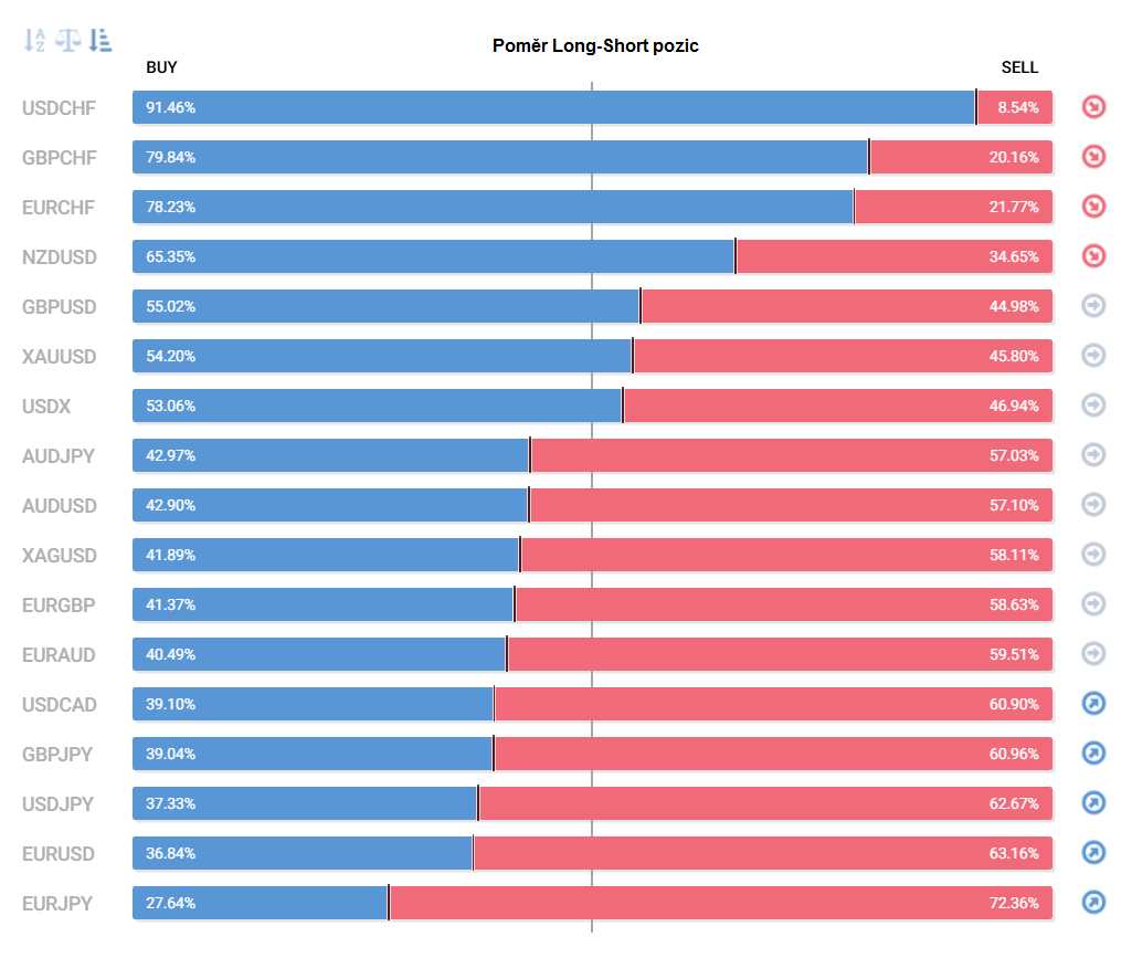 Přinášíme pohled na aktuálně otevřené pozice retailových obchodníků (běžných traderů) na forexu. Jde o reverzní - contrarian indikátor, který pokud naznačuje velkou míru short pozic, tak to může znamenat další pokračování v růstu (a naopak). Je to z důvodu předpokladu, že trh půjde proti retailu, který se většinu času snaží jít proti trendu.