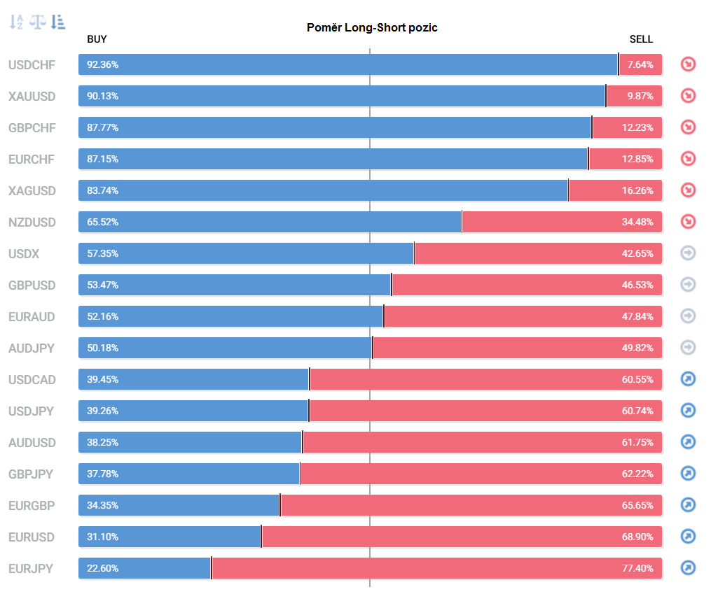 Přinášíme pohled na aktuálně otevřené pozice retailových obchodníků (běžných traderů) na forexu. Jde o reverzní - contrarian indikátor, který pokud naznačuje velkou míru short pozic, tak to může znamenat další pokračování v růstu (a naopak). Je to z důvodu předpokladu, že trh půjde proti retailu, který se většinu času snaží jít proti trendu.