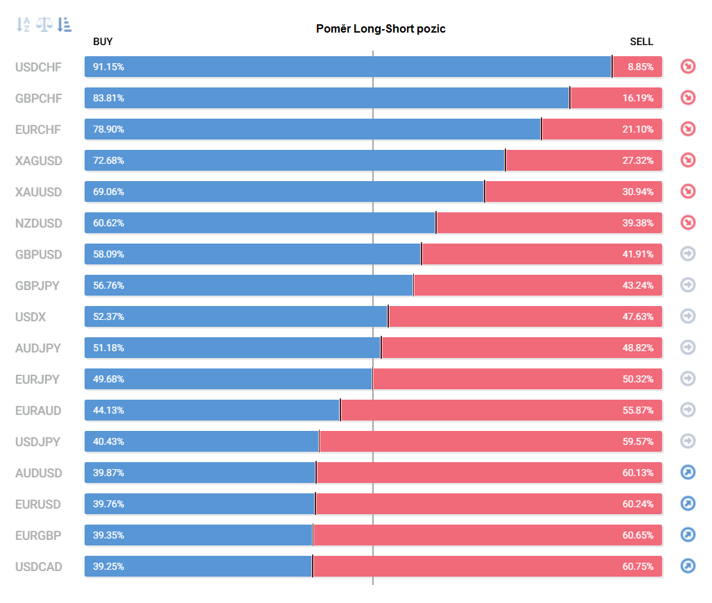 Přinášíme pohled na aktuálně otevřené pozice retailových obchodníků (běžných traderů) na forexu. Jde o reverzní - contrarian indikátor, který pokud naznačuje velkou míru short pozic, tak to může znamenat další pokračování v růstu (a naopak). Je to z důvodu předpokladu, že trh půjde proti retailu, který se většinu času snaží jít proti trendu. -