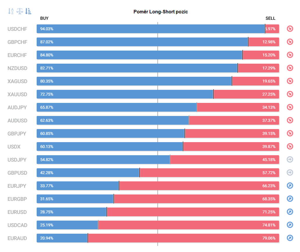 Přinášíme pohled na aktuálně otevřené pozice retailových obchodníků (běžných traderů) na forexu. Jde o reverzní - contrarian indikátor, který pokud naznačuje velkou míru short pozic, tak to může znamenat další pokračování v růstu (a naopak). Je to z důvodu předpokladu, že trh půjde proti retailu, který se většinu času snaží jít proti trendu.