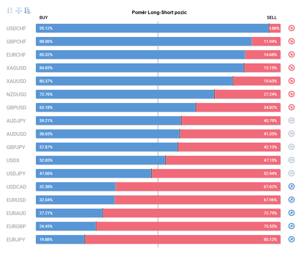 Přinášíme pohled na aktuálně otevřené pozice retailových obchodníků (běžných traderů) na forexu. Jde o reverzní - contrarian indikátor, který pokud naznačuje velkou míru short pozic, tak to může znamenat další pokračování v růstu (a naopak). Je to z důvodu předpokladu, že trh půjde proti retailu, který se většinu času snaží jít proti trendu. -