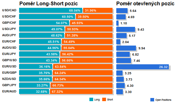 Přinášíme pohled na aktuálně otevřené pozice retailových obchodníků (běžných traderů) na forexu. Jde o reverzní - contrarian indikátor, který pokud naznačuje velkou míru short pozic, tak to může znamenat další pokračování v růstu (a naopak). Je to z důvodu předpokladu, že trh půjde proti retailu, který se většinu času snaží jít proti trendu. -