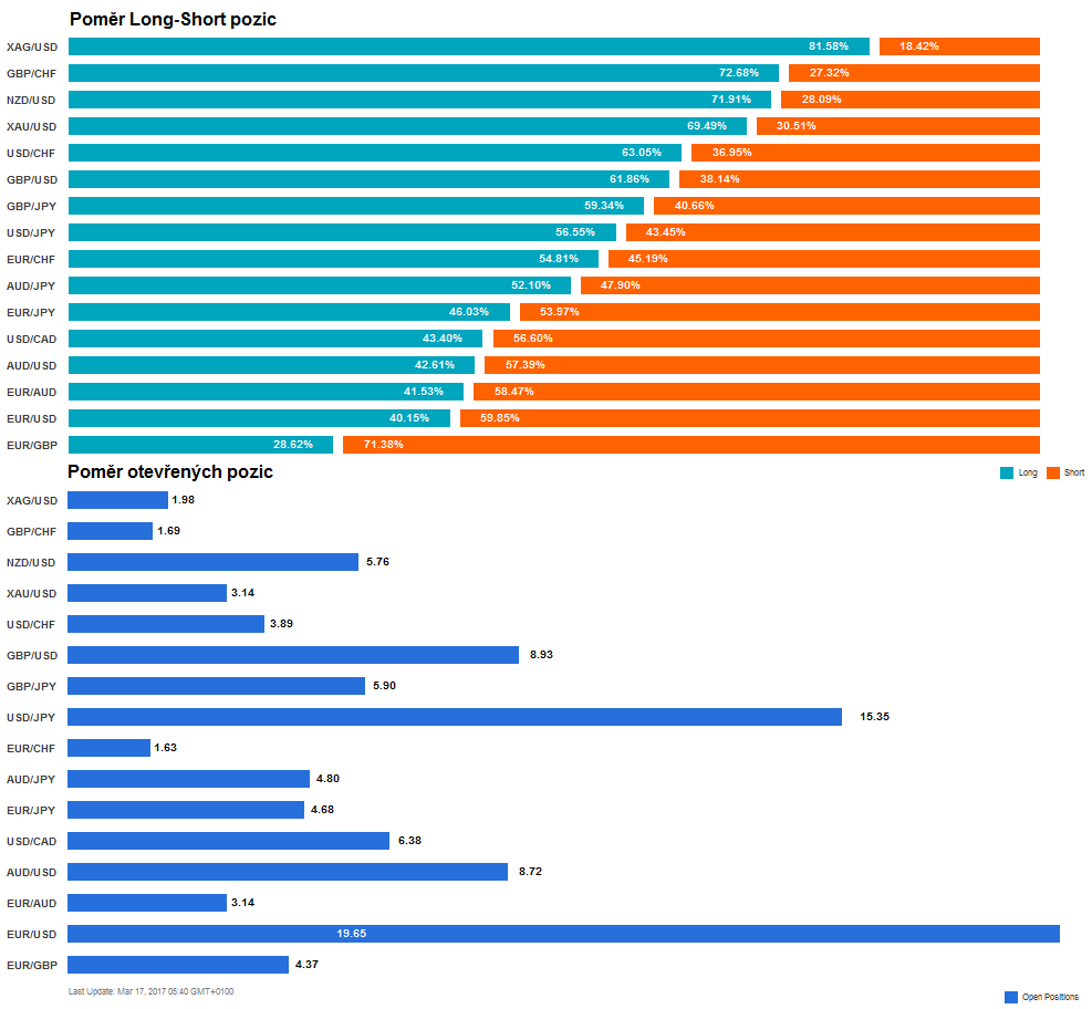 Přinášíme pohled na aktuálně otevřené pozice retailových obchodníků (běžných traderů) na forexu. Jde o reverzní - contrarian indikátor, který pokud naznačuje velkou míru short pozic, tak to může znamenat další pokračování v růstu (a naopak). Je to z důvodu předpokladu, že trh půjde proti retailu, který se většinu času snaží jít proti trendu. -