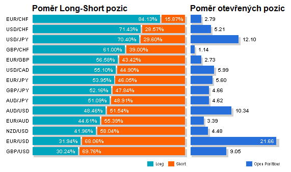 Přinášíme pohled na aktuálně otevřené pozice retailových obchodníků (běžných traderů) na forexu. Jde o reverzní - contrarian indikátor, který pokud naznačuje velkou míru short pozic, tak to může znamenat další pokračování v růstu (a naopak). Je to z důvodu předpokladu, že trh půjde proti retailu, který se většinu času snaží jít proti trendu. -