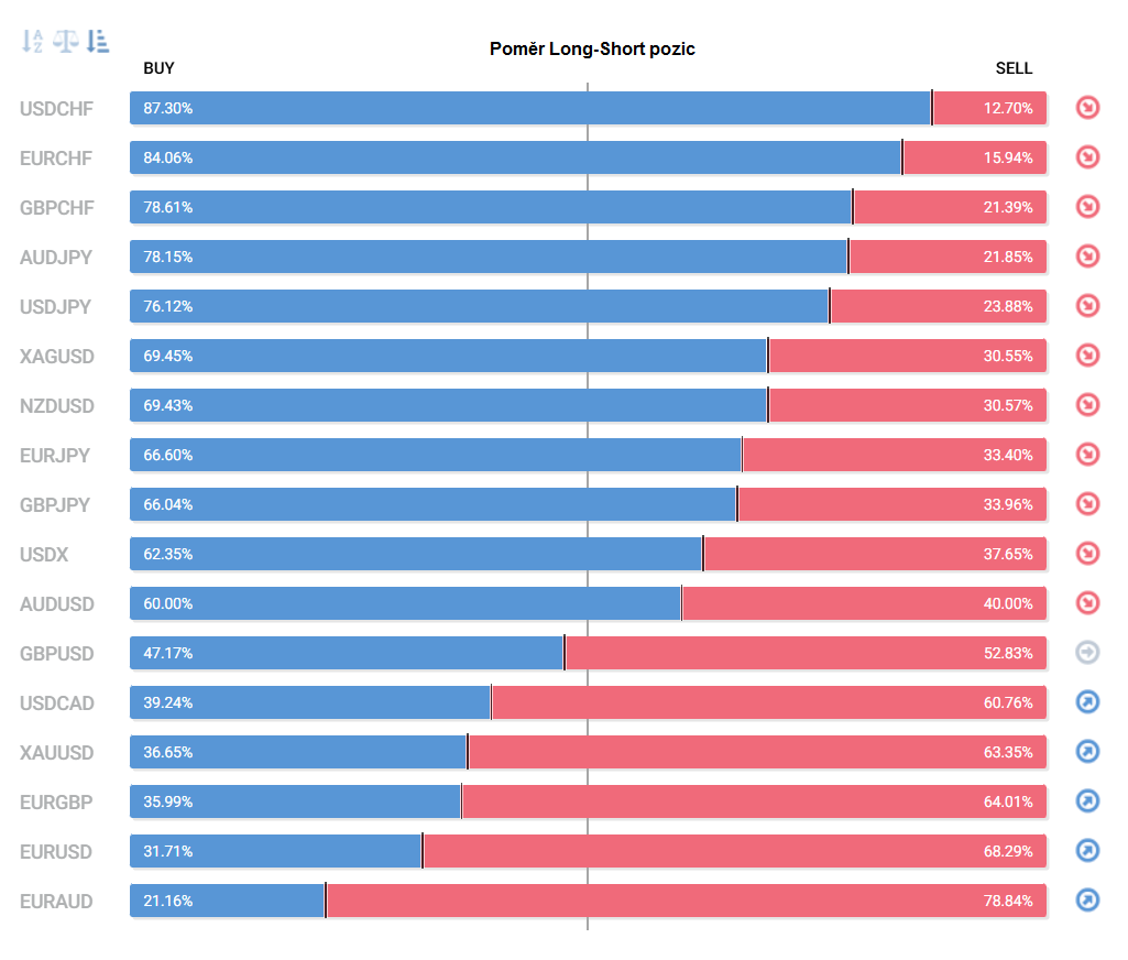 Přinášíme pohled na aktuálně otevřené pozice retailových obchodníků (běžných traderů) na forexu. Jde o reverzní - contrarian indikátor, který pokud naznačuje velkou míru short pozic, tak to může znamenat další pokračování v růstu (a naopak). Je to z důvodu předpokladu, že trh půjde proti retailu, který se většinu času snaží jít proti trendu.