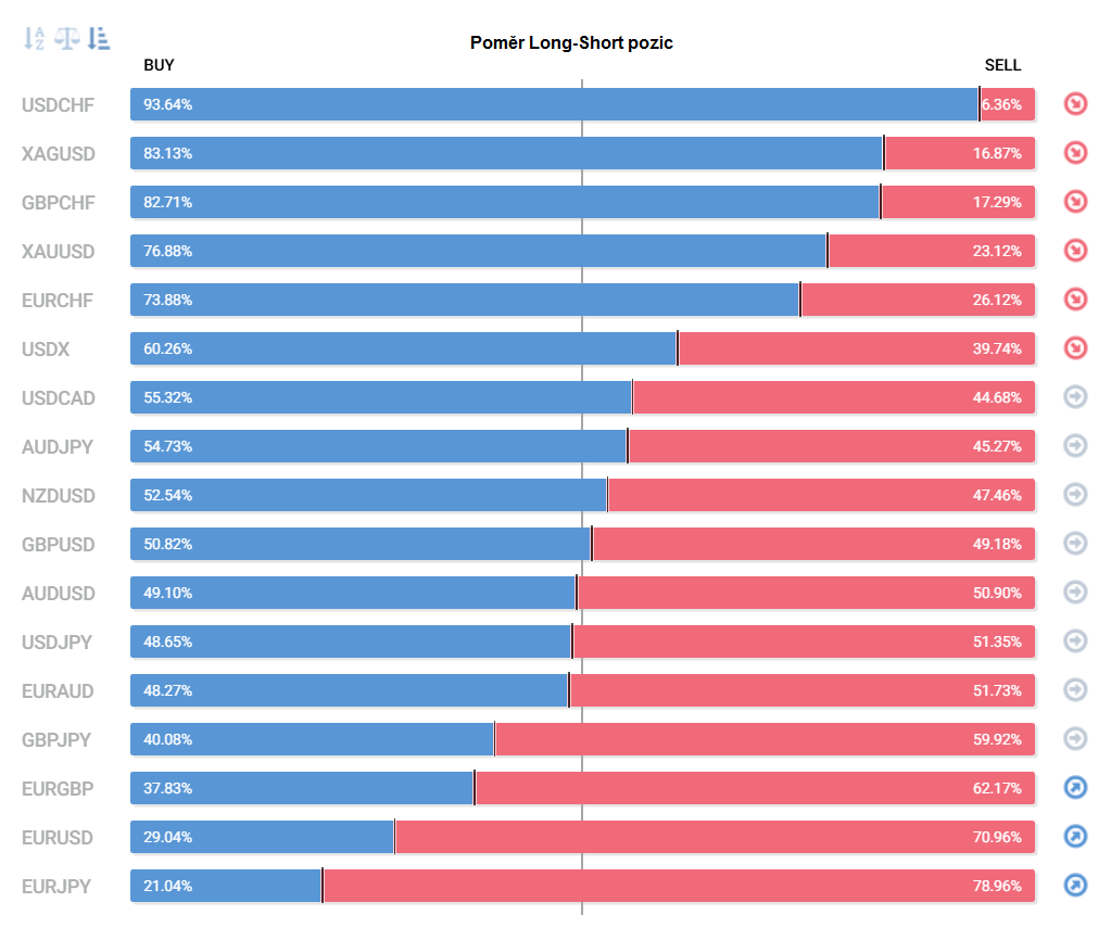 Přinášíme pohled na aktuálně otevřené pozice retailových obchodníků (běžných traderů) na forexu. Jde o reverzní - contrarian indikátor, který pokud naznačuje velkou míru short pozic, tak to může znamenat další pokračování v růstu (a naopak). Je to z důvodu předpokladu, že trh půjde proti retailu, který se většinu času snaží jít proti trendu. -